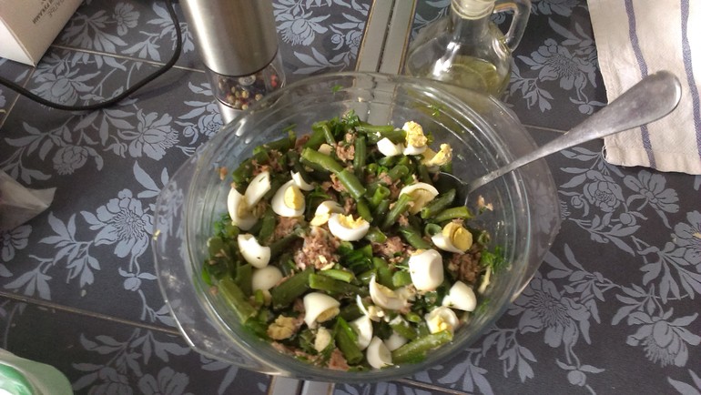 Зелень порубить с чесноком. Фасоль отварить, и можно на 2 минуты закинуть на сковороду. Добавить к зелени. Посолить, поперчить, сбрызнуть оливковым маслом. Туда же тунца, перемешать. Сверху украсить яйцами