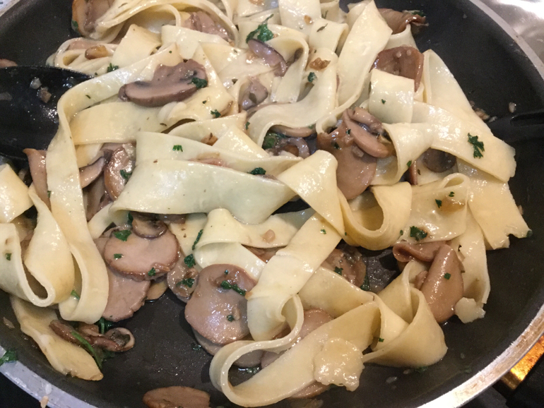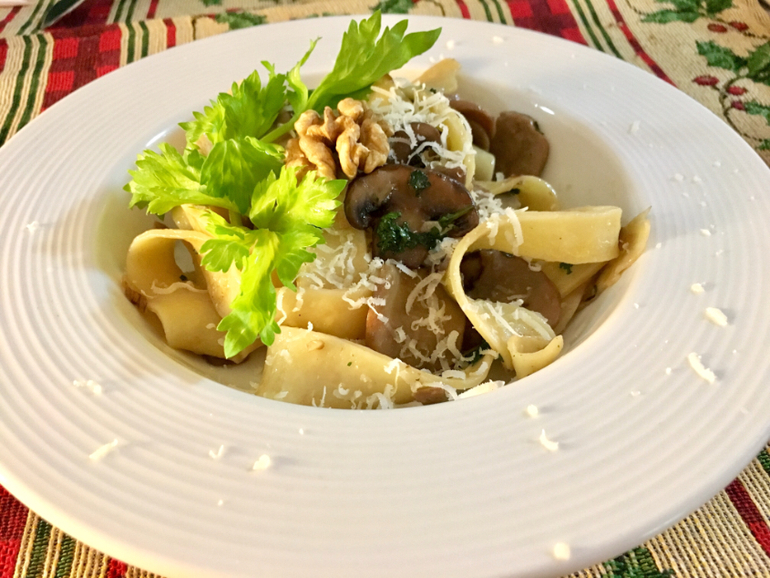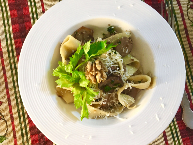 Homemade свежая паста парпаделли и грибной соус с орехами