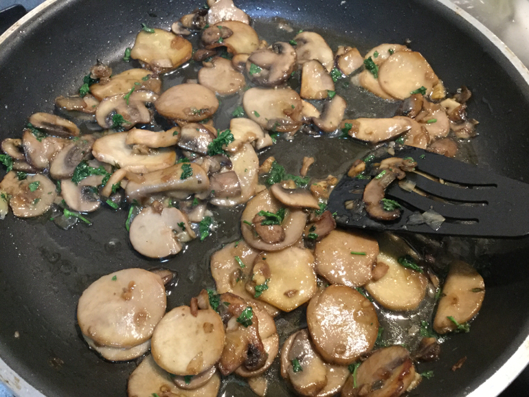 Грибы готовы, кидаем петрушку и орехи. 2-3 минуты и солим/перчим.