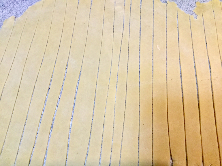 Режем на широкие полоски, даём подсохнуть немного. (Да неровно, но с линейкой стоять над тестом не собираюсь, и вообще это авторская задумка такая).