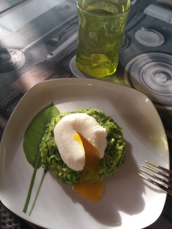 Тертый на терке цуккини, обжаренный на раст.масле в течение 4-5 минут. Сверху яичко пашот))) спасибо Свити за идею, теперь я их варю в пленке...просто замечательно!!!!