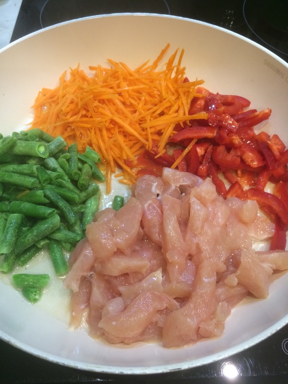 Нарезать овощи, курицу. Раскалить сковороду . Немного масла. Быстро обжарить. Добавить соус.