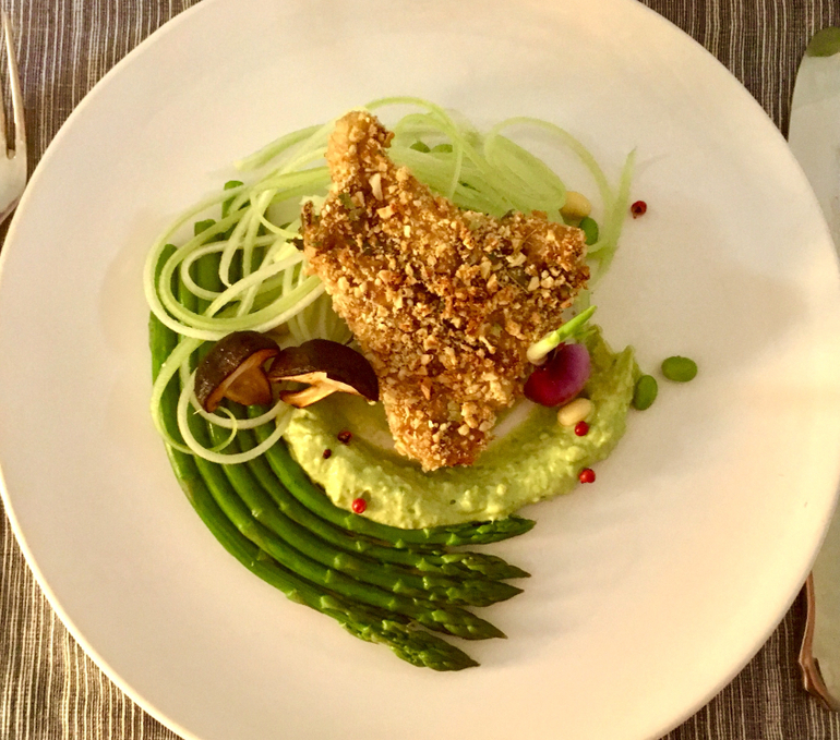 Филе промыть и просушить бумажным полотенцем. Слегка обмазать мисо пастой. Молотые орехи соединить с любимыми специями. Обвалять филе в орехах. 15 минут на 200' в духовке. Все! Соус из авокадо и лайма/лимона+ зелень, самый вкусный.