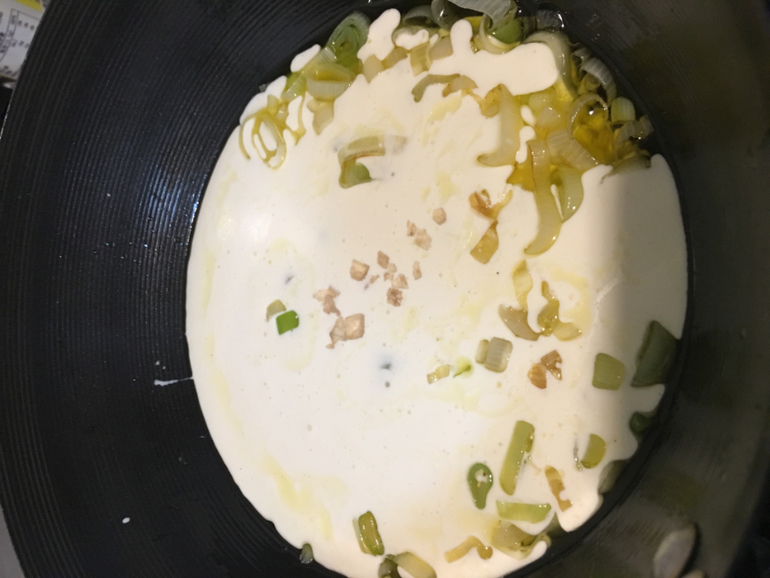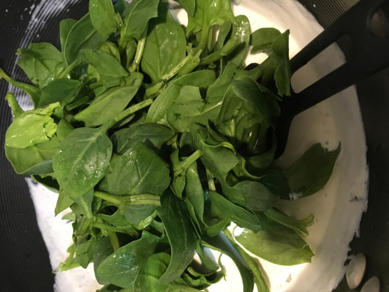 3. Бросить шпинат, довести до кипения, выключить. Добавить базилик (если имеется), накрыть все крышкой.