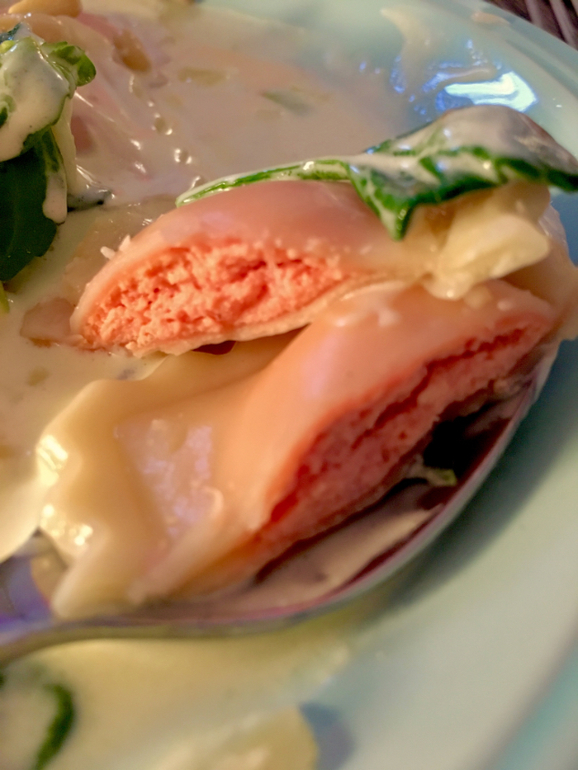 Нежные равиоли с рикоттой и печёной свёклой, в сливочном соусе со шпинатом