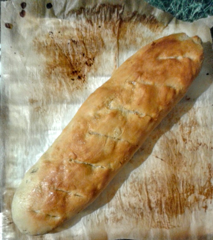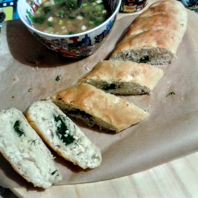 Взошло. Отщипнули. Сформировали батон, положили всходить, потом в середине примяли, положили нарезанный чеснок и укроп, залепили.