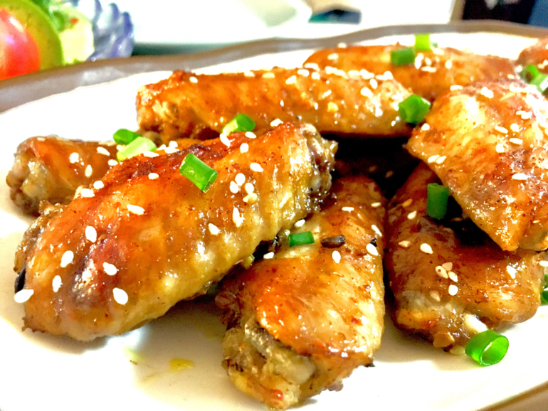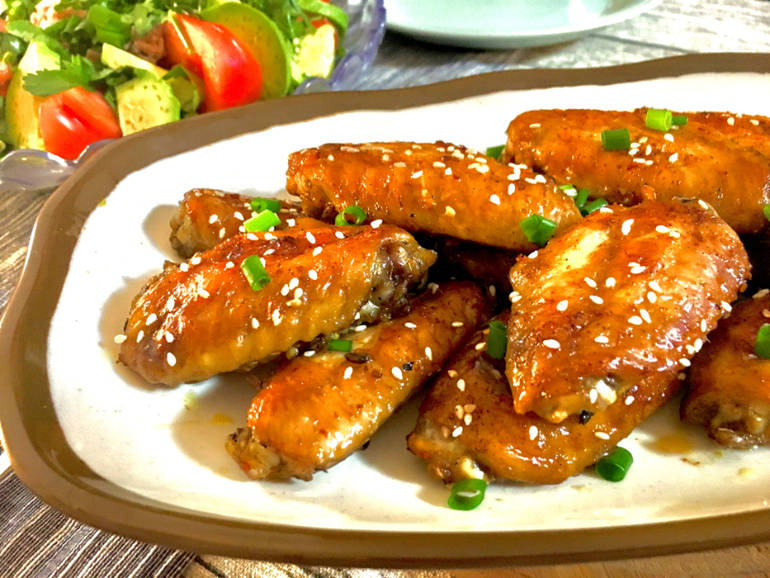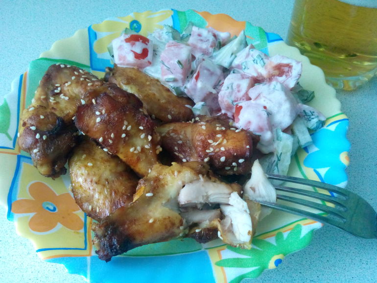 Делать: Все для маринада смешать. Закинуть туда промытые и обсушенные крылья. Перемешать. 2 часа в холодильнике, 1 ч. На 220 в духовке , переворачивая, как подрумянится одна сторона. За 5 минут до вытаскивания из духовки посыпать кунжутом. С салатом вообще атас. Приятного.