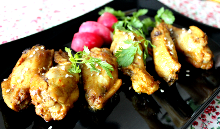 Надо:700 гр. крыльев,2 ч.л. Мелкопорубленного или давленого чеснока, 1ч.л.сушеного молотого лука, 5 ст.л. соевого соуса, 1ч.л.куркумы,1ч.л.молотого перца чили/паприки, 1 ч.л. кунжута .