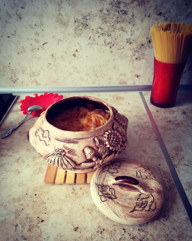Рецепт очень простой и творческий! Накидываем в горшочек всё то, что любите и на 1 час 20 мин в духовку))))