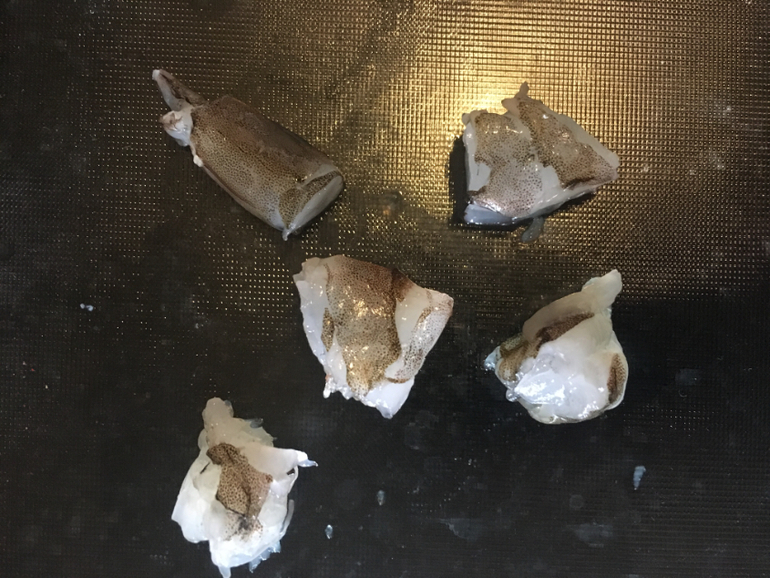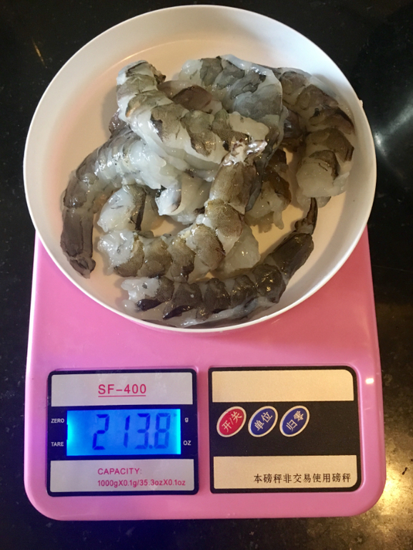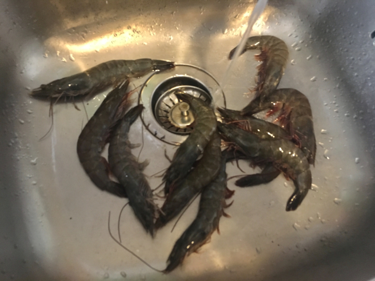 Лососевый фарш 0,5 кг , 10 крупный креветок, половина луковицы, 1 яйцо, 2 ст.л. сливок, соль/перец.