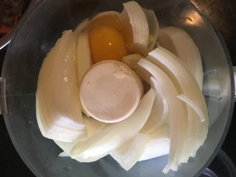 Добавить к фаршу. Лук взбить в блендере с яйцом.