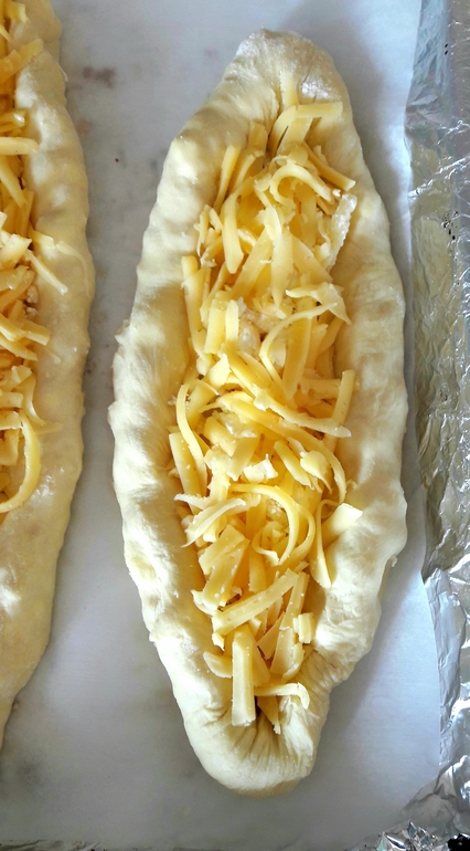 Из теста раскатали овал, по краям выложили начинку и валиком скрутили. Сформировали лодочку. В середину начинку и много сыра. Оставили минут на 15.