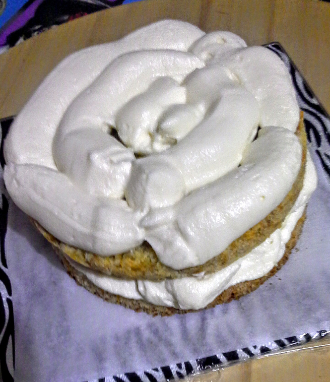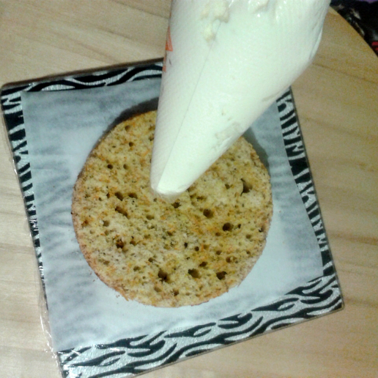Крем перекладываю в мешок (я люблю одноразовые) и по кругу толстым слоем намазываем.