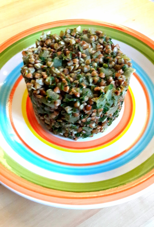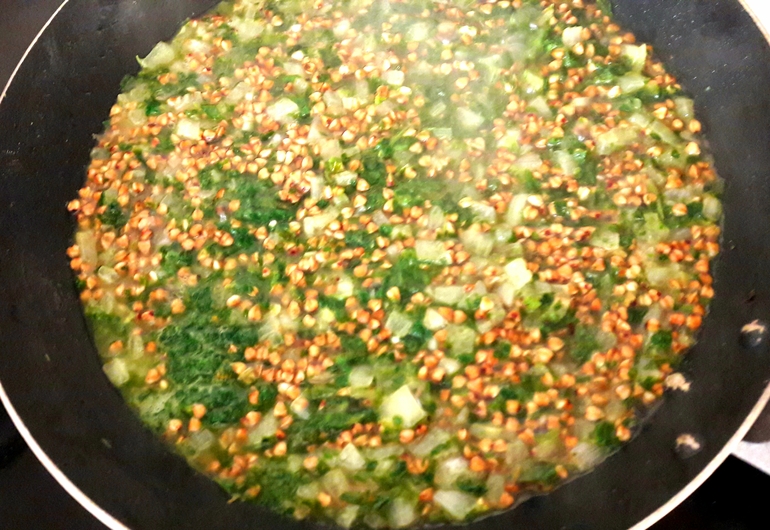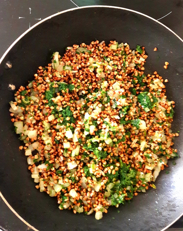 Пассируем лук на смеси оливкового и сливочного. Минуты через 3 добавляю шпинат-заморозку (свежий я бы добавляла после гречки). Следом гречку. Обжариваем пару минут.