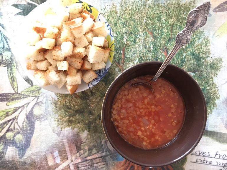 Ставим на огонь томатный сок, если сильно густой, добавляем воды. У меня вышло 2/3 сока и 1/3 воды. Мой сок уже соленый, поэтому никакой соли. Кладем чечевицу. Моя чечевица варится около 15 минут.