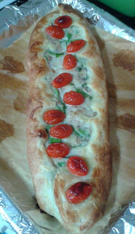 Это лодка из слоеного теста из творога с тунцом. К тунцу очень подходят оливки и артишоки - можно добавилть.