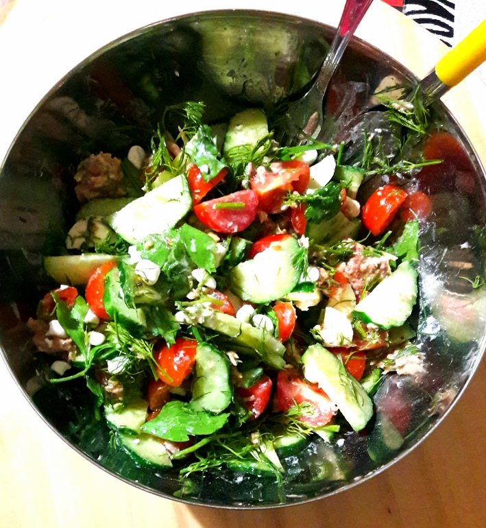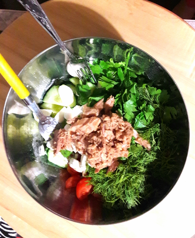 Огурец, помидор, тунец, зелень, мини моцарелла (Ви всунула) и зерненый творог. Заправка у нас всегда масло и лимонный сок. Масло бывает просто семечковое/с травками/с вял.томатами/с чили (это только мне)/с базиликом и еще какое-то.