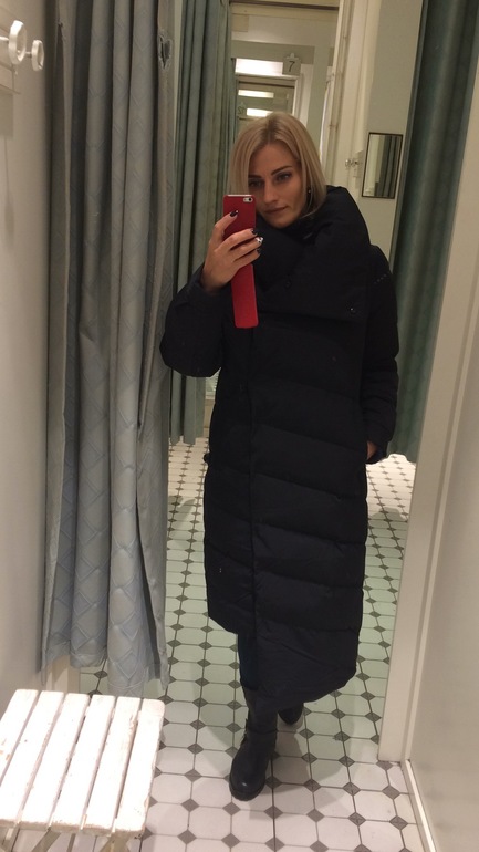 Пуховик больше, чем мне по идее надо, но из-за фасона вроде этого не видно.
