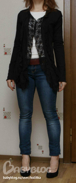 кофта с рюшами такая сомнетельная, что ее только под светлый топ. и можно иногда пояс тонкий черный на него, но прри этом, расстегните сверху поговки, что от лица черное убрать