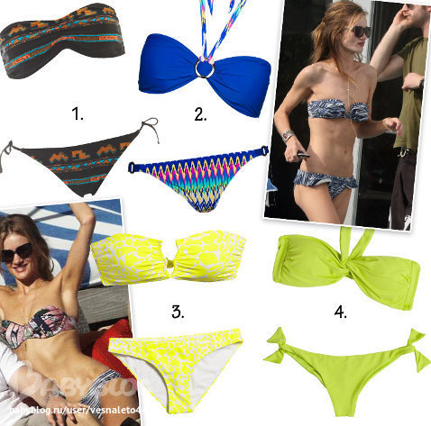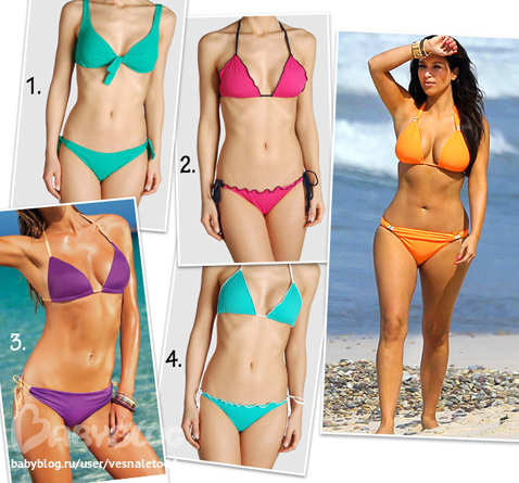 1. Купальник Incity (лиф - 359 руб., плавки - 299 руб.),2. Купальник Pull and Bear (лиф - 799 руб., плавки - 699 руб.); 3. Купальник Ann Christine (лиф - 499 руб., плавки - 379 руб.); 4. Купальник American Eagle, цена по запросу