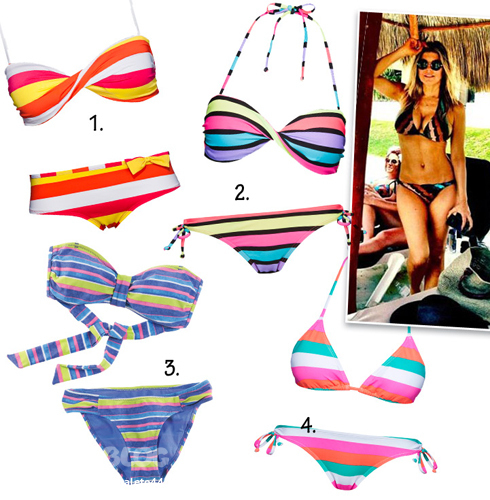 Цветные полоски привлекают не хуже, чем яркий принт. Имейте в виду: обладательницам большой груди стоит выбирать купальники на толстых лямках, как у Ферги. А полосатые бикини и купальники-бандо подойдут для маленького бюста (к слову, широкая полоска визуально прибавит несколько необходимых сантиметров)