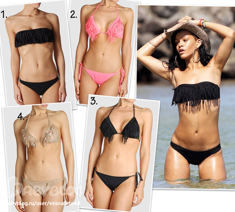 Купальники с бахромой – хит этого лета (ведь этнические мотивы сегодня в моде). Но уместно она выглядит только на верхе купальника. Кстати, бахрома визуально придает дополнительный объем груди. Этот тренд полюбила Рианна. Сегодня у певицы уже есть целая коллекция таких моделей
