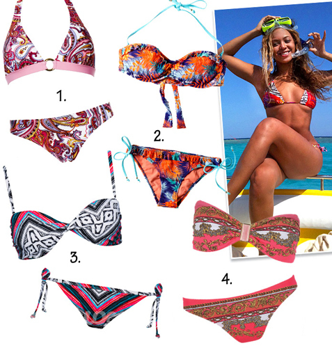 В этом сезоне модные принты (от тропических и цветочных до «турецкого огурца») появились даже на купальниках. Яркий рисунок отлично смотрится на раздельных моделях, как у Бейонсе. Но помните: скрывать недостатки в таком купальнике сложно, зато можно подчеркнуть достоинства: красивую грудь,