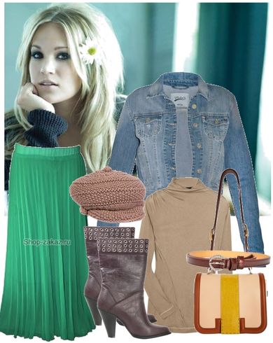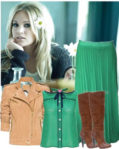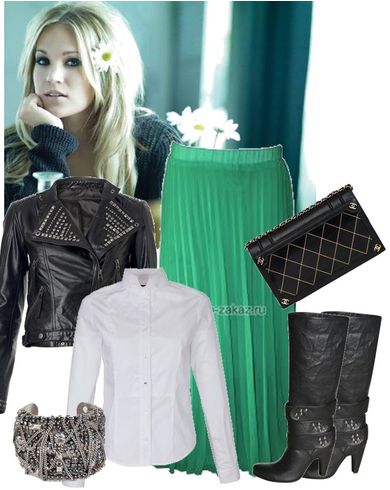 видела на девочке-зел.юбка такая,пиджак черный и черный топ под ним.браслет золотой на руке,распущенные волосы- очень красиво