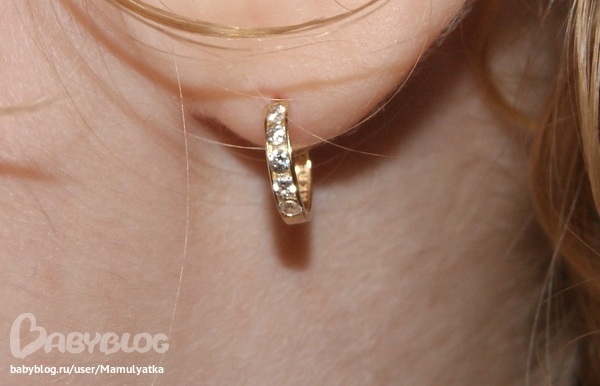 Проколола дочке уши весной пистолетом. Там вставляются сережки-пусеты (гвоздики). Отходив положенные 3 недели захотели сережки поменять на золотые. Я купила ей нежные сережки-цветочки с замочком петелькой. Замок надежный, но постоянно цеплялся за одежду и волосы. На ДР бабушка подарила ей колечки, похожие на ваши, с сапфирами. Замок ненадежный, растегивается. Сняли их и положили обратно в коробку. А дочь сказала, что самые удобные были гвоздики-пусеты. И спать удобно, и одеваться-раздеваться и не боится потерять.