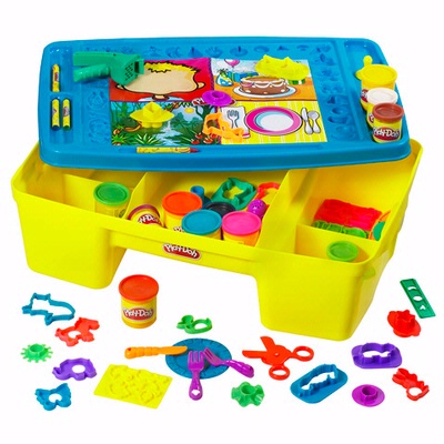 сам пластиковый столик очень удобен для ребенка. Вес около 5кг. в набор входит 11 баночек с пластелином+всякие штуки для резки,формочки итд