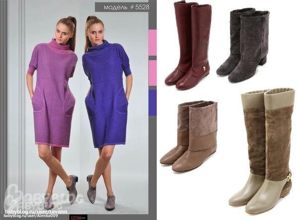 Елена, для первых трикотажных платьев лучше подойдет модели не черного цвета: оттенки серого, темная слива, черника, коричневый, темно-синий. Для второго платья - черные сапоги, включая ботфорты, плюс те же слива, черника, фиолетовый - эти тоны поддержат цвет принта. Выбранные вами модели ближе по стилю к первым платьям. Второе требует чего-то более женственного. Ну это, если придираться:))) В целом, вы выбрали универсальные варианты!