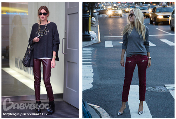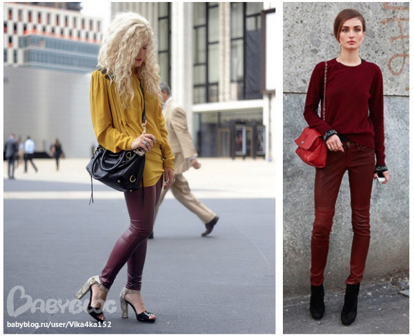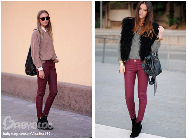 Цвет варьируется от ярко -красного до модного, винного. Модели, в основном, дудочки, но, встречаются широкие брюки и цветные джинсы.