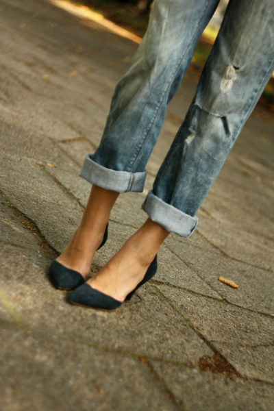 Сразу работу вспомнила - джинсы (правда классика скорее, в общем без дыр и блесток:) и лодочки! Даже в голову не приходило, что так НЕ носят)