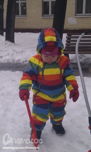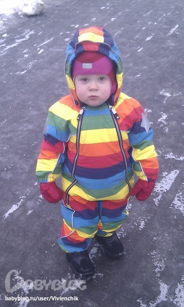 Сегодня обновили радугу, на улице -1 )) Супер комбез, на горке по мокрому снегу ничё не промокло и не замёрзло и такой яркий))) На наш рост87 и вес 15 кг сел отлично с небольшим запасом в ножках и рукавчиках.