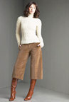 Мне кажется, что подобные брюки можно одеть с невысокими (выше окончания штанины) сапожками. Ботильоны тоже допустимы, но чтобы избежать эффекта укорачивания ноги, необходимо подобрать колготы или гольфы под цвет обуви или под цвет брюк.