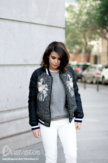 Идеальное сочетание бомбера с узкими потертыми джинсами, белой футболкой и обувью на плоском ходу. Я бы не рекомендовала создавать 100% -й спортивный образ, но при большом желании, это тоже воможно.