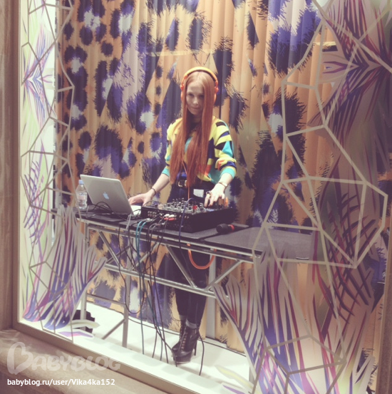 В витрине магазина за диджейским пультом стояла одна из самых модных DJ Москвы - Саша Федорова.