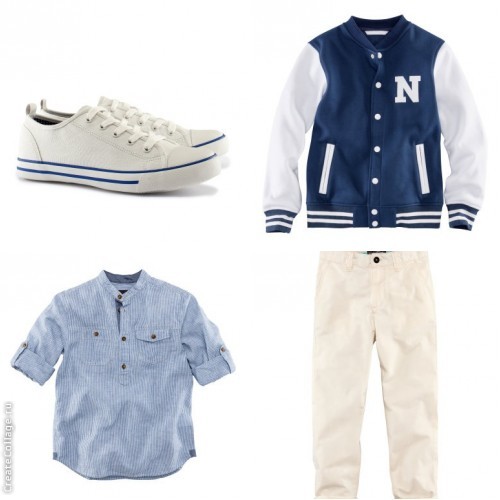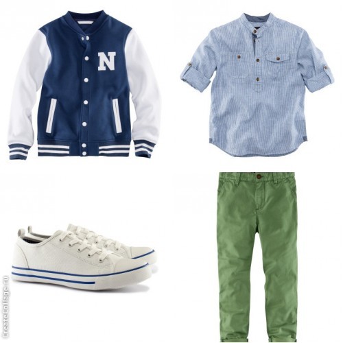 Я считаю, что рубашка и брюки по стилю сочетаются идеально. Под них какие-нибудь легкие мокасины, но никак не кеды. Ну, во всяком случае, чисто спортивные кеды, как эти - никак. Более классические еще можно рассмотреть. А вот под курточку кеды с белым и синим цветом, но никак не молочным. Молочный в сочетании с белым выглядит как грязный белый, не стоит их мешать в одном комплекте.
