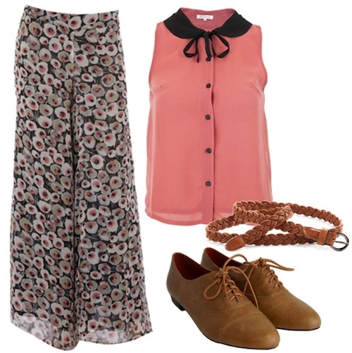 короткое платье без рукавов, самое оно! Блузку не нужно, а брюкит палаццо идут только высоким и худым. Я, напр., не высокая (хоть и худая), на мне смотрится отстойно. А вот платьице, в стиле 60-х, как на фото ниже, идет практически всем.