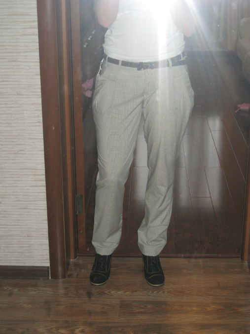ДВ! На фото в профиль кажется, что брюки велики. Попробуйте со шпильками поэкспериментировать и еще со светлой обувью.