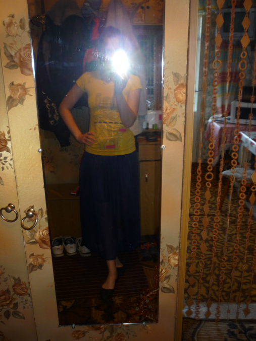 Распространненая юбка,правда заказывала фиолетовую,а пришла темно-синяя...(так длинна вроде норм,это я натянула ее выше пупка,иначе живот свисает)))