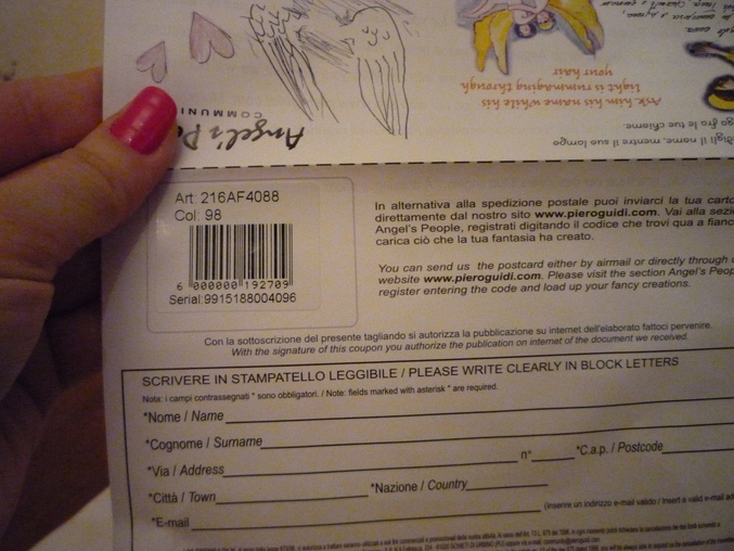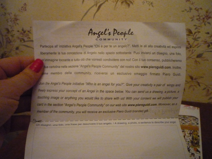 4. Сумка упакована в фирменный пыльник. Внутри сумочки каталог с продукцией и письмо от П.Гуиди, в котором он предлагает вступить в сообщество Ангелы среди людей, и прислать ответ на вопрос "Кто является ангелом для тебя". Пьеро обещает разместить твой ответ (рисунок) на форуме сообщества Angels People Community и наградить тебя как члена сообщества эксклюзивным брендовым подарком. Также имеется паспорт сумки, на котором указаны артикул, цвет, серия и штрих-код.