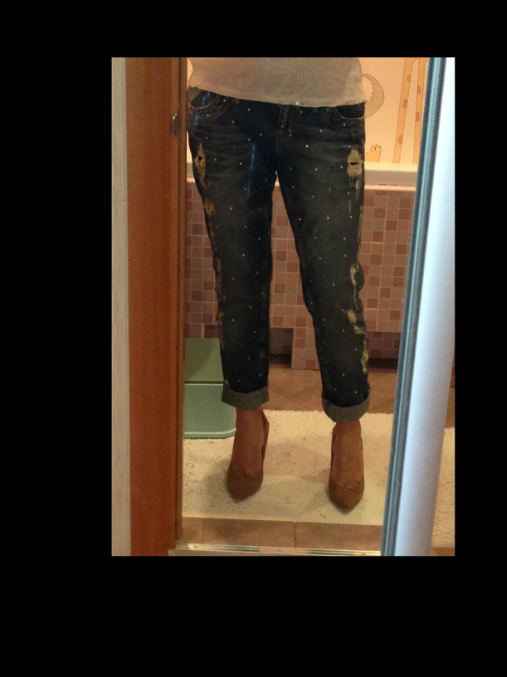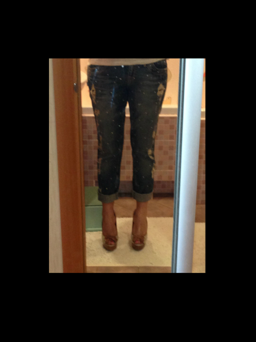 ПосоветуйтеДобрый день! Джинсы были куплены давно в припадке шопоголизма. Были малы не носила. Сейчас немного великоваты. Если от вернуть то длинны, нужно чуток укоротить. А если с подворотами то (ну очень хочется так думать) походи на бойфренды. Гламурные такие)))) они еще в стразах. Это немного смущает. Изза этого не могу подобрать нормальный верх. Вобщем посмотрите и дайте совет пожалуйста! За фон извините. Как выяснилось зеркала нормально нет((((