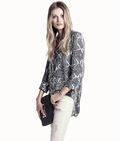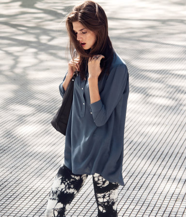 Черно-белая, прозрачная, шифоновая. Свободная. Коротковатая, ягодицы прикрывает наполовину, спереди короче. Изначально покупала ее вместе вот с этими брюками