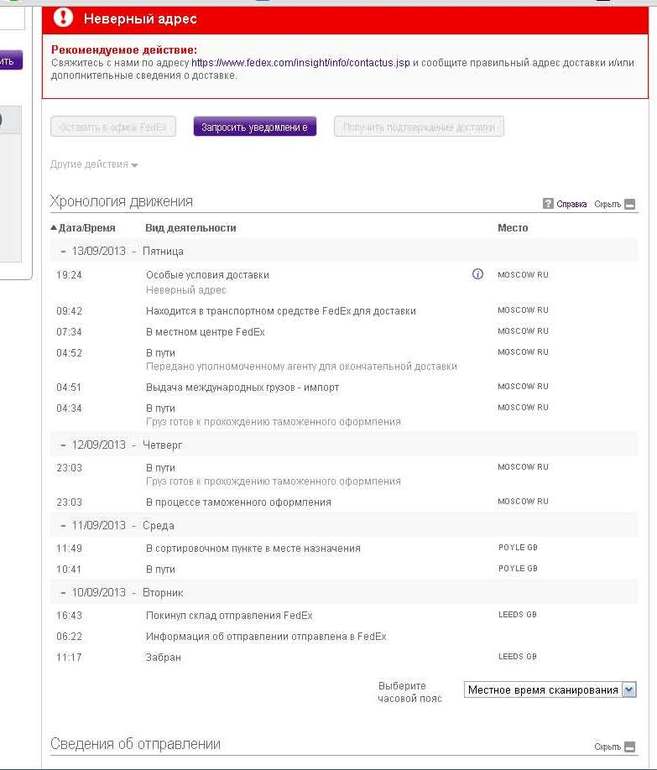 Интернет-магазиныЗаказала посылку, уже не первый раз, правда на этот раз с новой почты, чтобы получить скидку в 300р.!!! По трекинг-номеру на Fedex отслеживала, вчера моя посылочка уже была в "Транспортном средстве Fedex для доставки" в Москве (это цитата с сайта fedex). Я была уверена что курьер ее вот-вот привезет. И что же? Сегодня утром захожу на Fedex, написано что НЕВЕРНЫЙ АДРЕС у меня указан. К слову, адрес указан правильный.