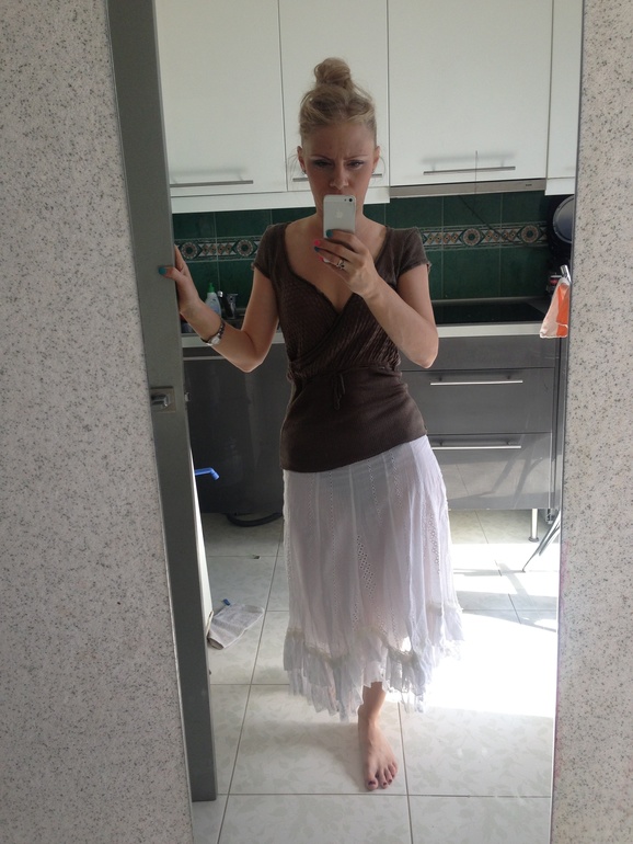 Белую юбку я бы поместила в стиль кантри. Мне кажется это прямо твой стиль! Надеюсь шляпа у тебя есть? И сумка с бахромой?Можно попробовать с клетчатой рубашкой (которая над тельняшкой в посте) и с ремнем сверху... Но нужно казаки и сумку в стиле. Иначе будет странно.С коричневой блузкой в принципе нормально. Идеально, для твоей фигуры и этой юбки, кардиган грубой вязки.