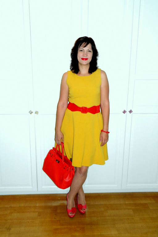 как на выставке красавица А желтое платье да но поменьше красного. И юбка джинс не нравится