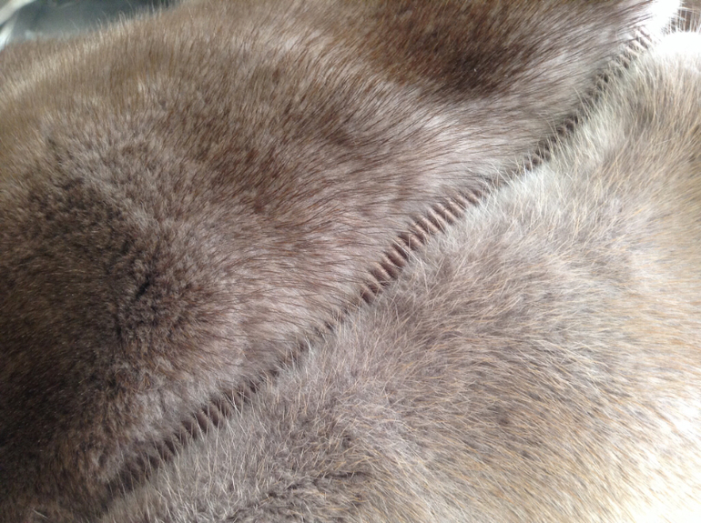 Цвет вроде называется серый с лиловым. Мне кажется что отчетливо виден темно- грязно розовый с серым. И еще между шкурками трикотаж декоративный выделан))