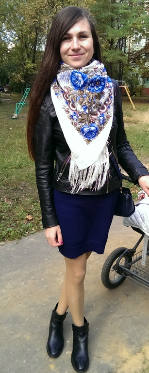 Платок красивый и по цветам "ваш". Но, честно говоря — вот так его носить — ломает пропорции ваши совсем!Его можно в этот комплект, но... тогда он должен был бы быть значительно меньше, и частью под курткой ))) но и тогда его нужно обыгрывать другими вещами в комплекте, ибо сам по себе в комплекте с косухой — несколько чужеродно как по мне.Я ношу подобный платок тоже с косухой, но она у меня нюдового цвета, платок небольшой и внутрь, а вниз — длинная юбка.