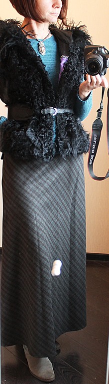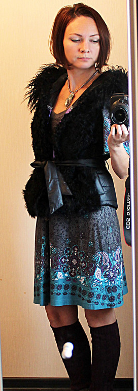 Блин, мне очень нравится сочетание и чулки, но вот зад жилета не клеится с платьем(( Это как раз то, про что я говорила. Спереди здорово. Пояс я бы простой кож. черный надела, без яркой пряжки.